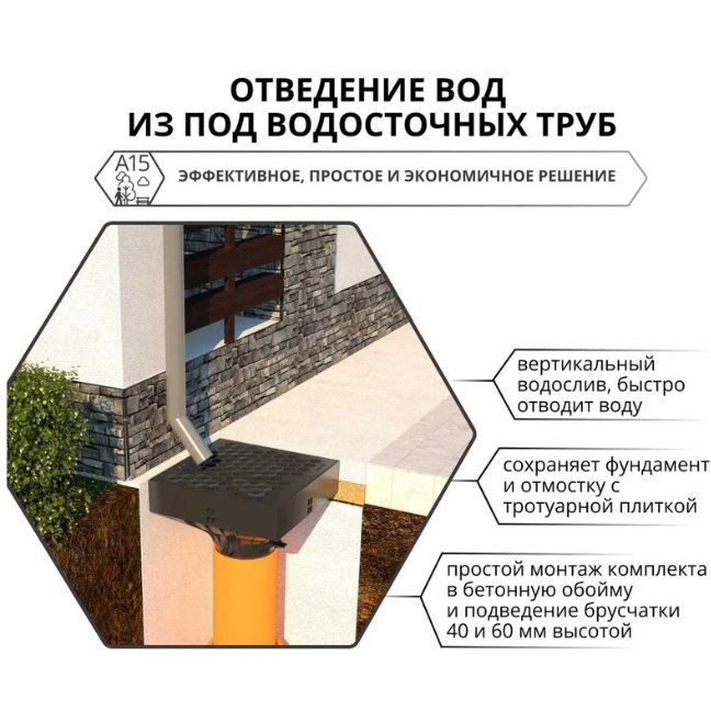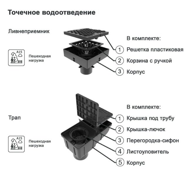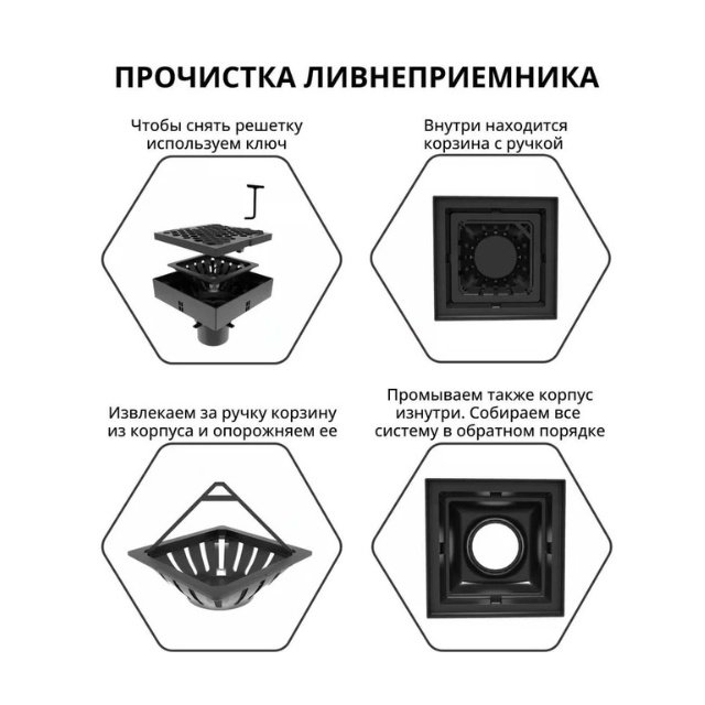 Ливнеприемник применяется для отведения вод из-под водосточных труб, а также с площадок и террас, как трап наружной канализации. Укомплектован корзиной для сбора мусора и решеткой с рисунком "сота". Решетка имеет надежные защелки и надежно фиксируется на ливнеприемнике. К выпуску ливнеприемника легко подключается труба внешней канализации диаметром 110мм. Ливнеприемник имеет горизонтальный выпуск для подключения трубы, что ускоряет отведение воды. Рекомендуется использовать в зонах с пешеходным движением.