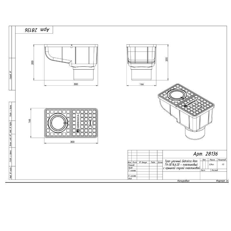Уличный пластиковый трап (в сборе) предназначен для перенаправления дождевой воды, стекающей по водосточным трубам, в дренажную систему. Полностью исключает разбрызгивание капель, порчу стенового покрытия, грунта, ближайших садово-парковых насаждений. В комплект поставки уличного трапа включены: корпус, глухая крышка и крышка с регулируемыми выбиваемыми под размер водосточной трубы отверстиями, перегородка и сетка, необходимая для удержания мусора и других посторонних предметов. Сечение выпускного патрубка 110 мм.