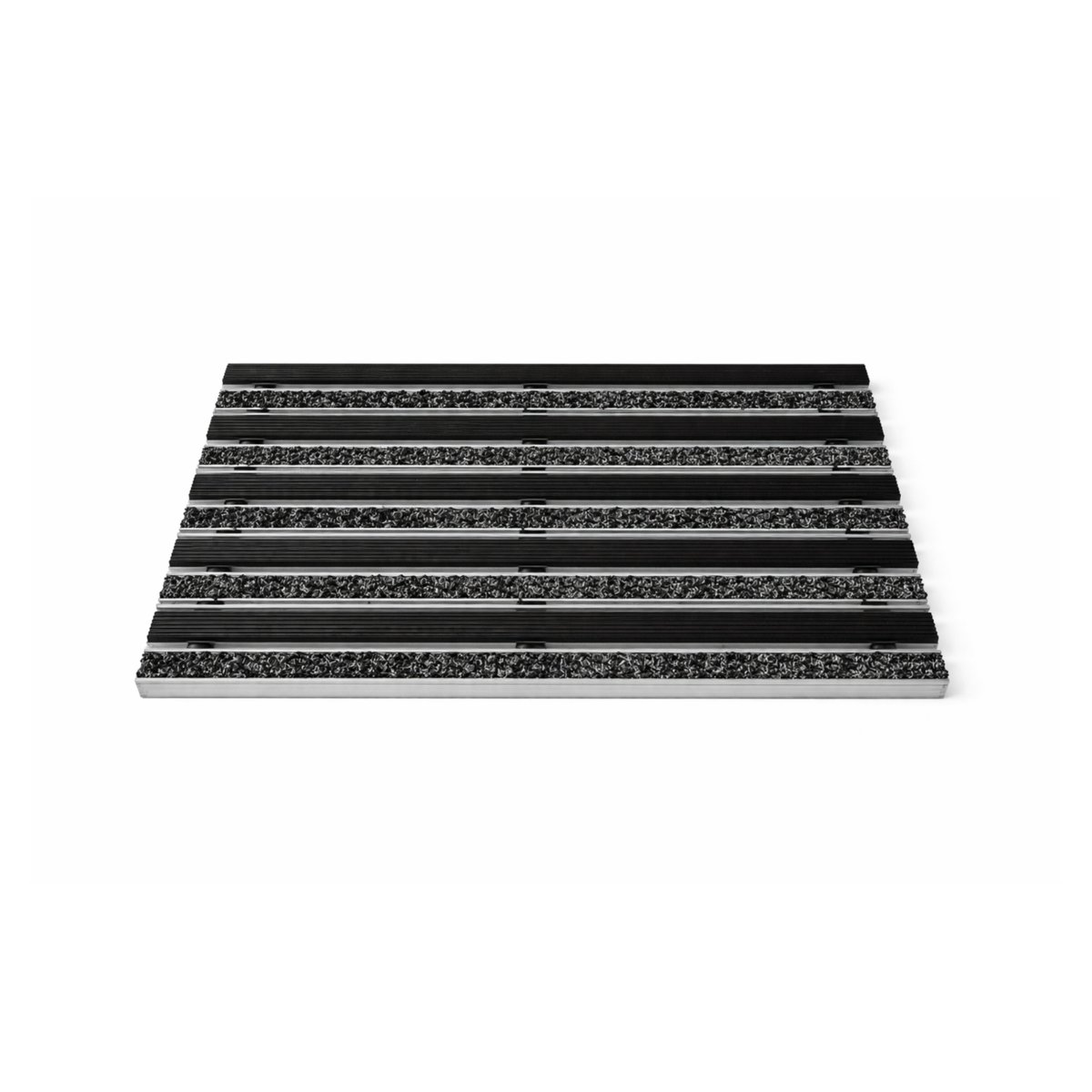 Придверная решетка Gidrolica Step резина+текстиль+скребок 390х590 мм выполнена из высокопрочных алюминиевых профилей, дополнительно оснащенных очищающими вставками (резиновыми, текстильными, скребковыми). В качестве крепежей используются стальные оцинкованные тросы с амортизирующими уплотнителями. Эти амортизаторы обеспечивают стабильные зазоры 3-6 мм между рабочими перемычками. Такие параметры позволяют эффективно собрать мелкий и средний мусор. Монтаж решетчатой конструкции Gidrolica Step разрешается осуществлять непосредственно на пол или в особый приямок глубиной 25 мм. Как правило, таким образом комплектуются входные группы в здания торгового, коммерческого, офисного, жилого назначения. Заказать изделие можно по телефону или через сайт. Если нужно, мы проведем монтажные работы на вашем объекте.