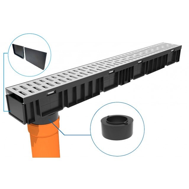 Вариант со стальной решеткой щелевой структуры в серии каналов из морозостойкого пластика (полипропилена) с шириной гидравлического сечения 100 мм - лоток водоотводный пластиковый Гидролика Лайт с высотой по внешней кромке 96 мм. Конструкция, для мест с небольшой площадью водосбора, сограничением по губине заложения, где предполагаются незначительные механические нагрузки на линию дренажа. С характеристикой проходного П-образного сечения 54,2 см² пропускная способность желоба составляет 2,5 литров в секунду, при условии уклона 0,5% или 5 мм. на 1 метр длины водоотвода.